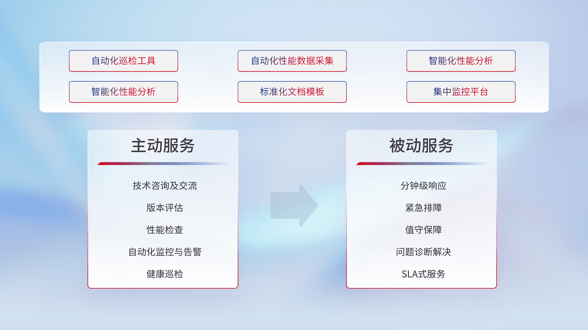 智能化工具和标准化文档,,保障服务质量,,提供主动服务(包含技术咨询、、、版本评估、、、、性能检查、、自动化监控与告警、、、健康巡检)和被动服务包含(分钟级响应、、、、紧急排障、、、、值守保障、、、、问题诊断解决、、、、SLA服务)。。。